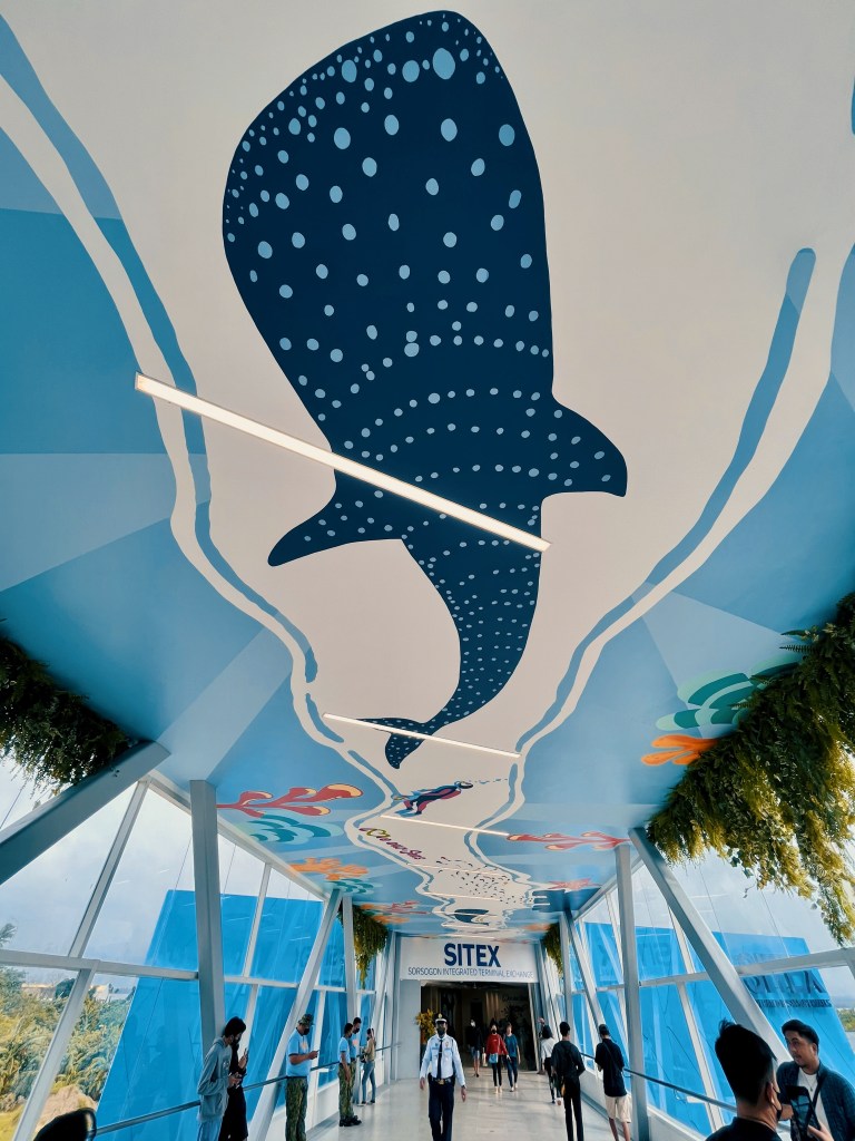 The 40,000 square meter mall comes in with a new and innovative building design. It has a sophisticated facade, a vibrant blue pattern inside the mall, large storefronts that are open and welcoming, glass entrances, covered walkways, and a bridgelink that connects to Sorsogon Integrated Terminal Exchange (SITEX), which overlooks the coastal road and offers breathtaking views of the sunrise and sunset over the Bulusan Volcano and the mountain ranges of Juban and Magallanes towns in the background.
